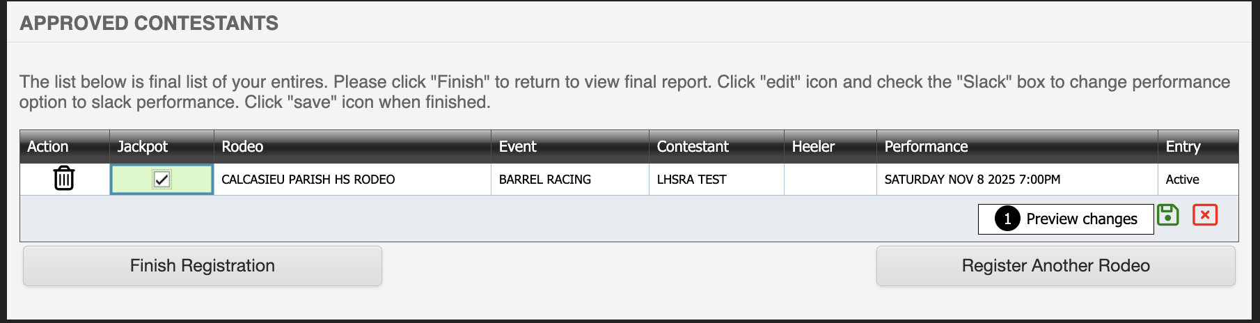 After you select the jackpot box, please select the green save button at the bottom right before selecting Finish Registration. If you do not click save, it will not save your jackpot entry. Daysheets